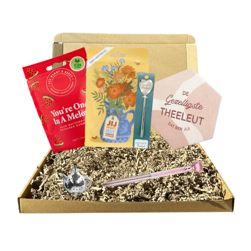 Een heerlijk samengesteld cadeau dat zorgt voor ontspanning, gezelligheid en een glimlach – precies zoals een goed theemoment hoort te zijn.