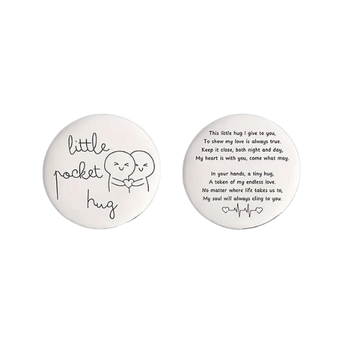 Aan de ene kant staat het hartverwarmende woord “Little Pocket Hug”, aan de andere kant een krachtige reminder: